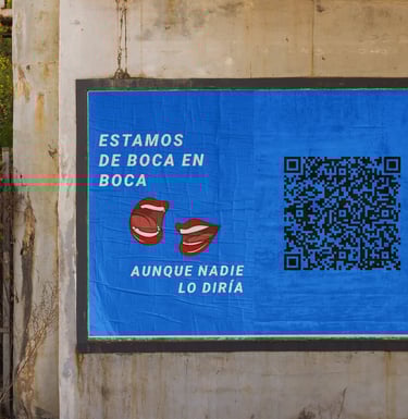Cartelería urbana minimalista: Azul corporativo + tipografía Roboto Black + ilustración de dos bocas. Presencia en zonas de tránsito, puntos clave de ocio, espacios de verano.